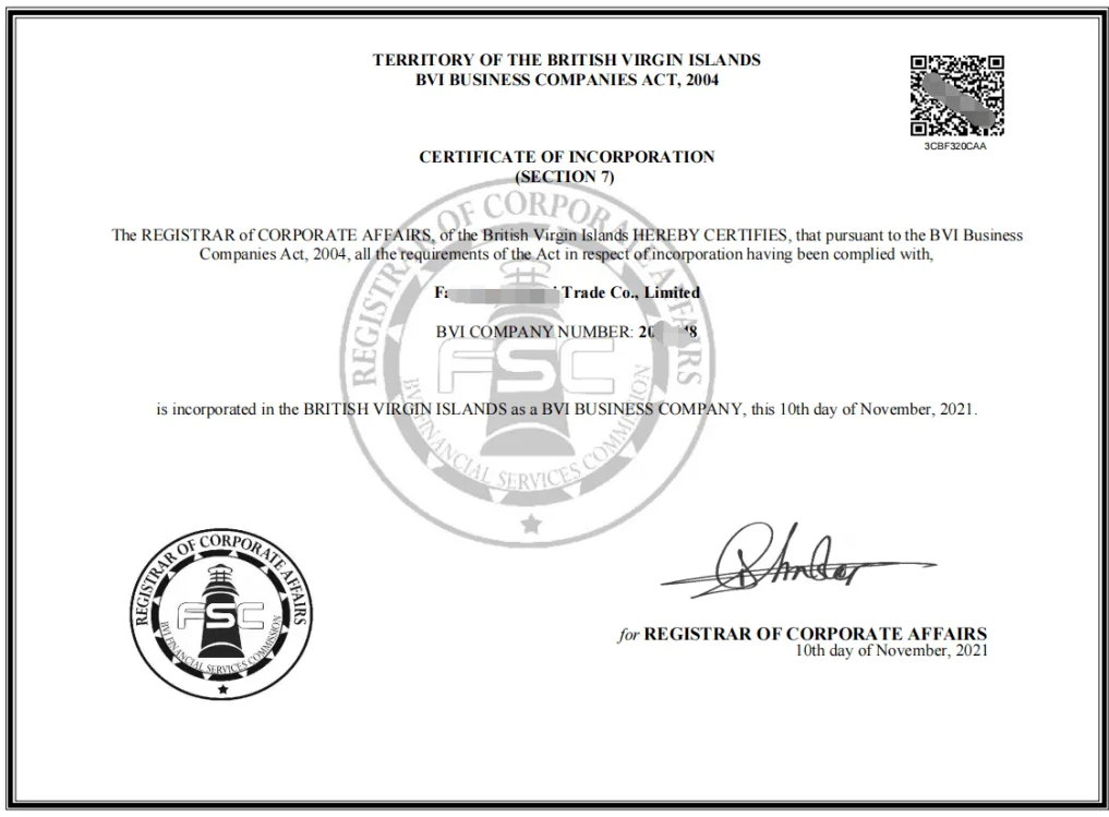(英屬維爾京群島公司注冊證書樣本)