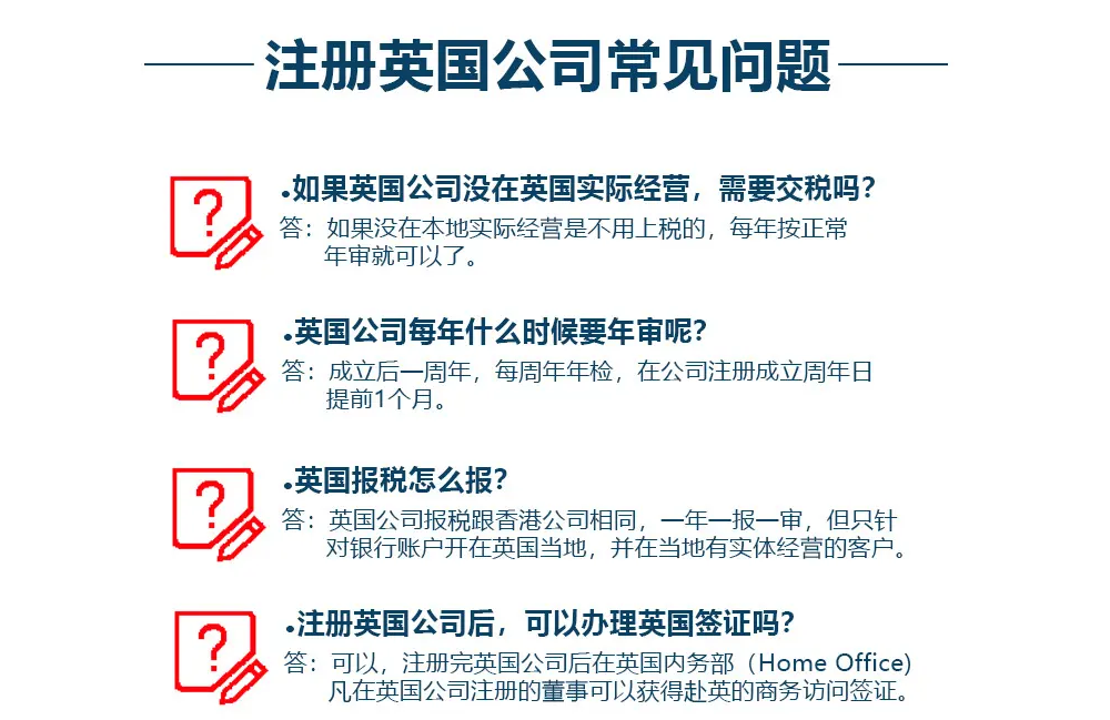 除了以上注冊英國公司的資料和流程,英國公司注冊后,還需要進行年審。不按時年審的,要罰款,或者先發(fā)警告文書。如果公司在90天內未能及時辦理,公司將收到公司已注銷的通知,沒有任何反駁的機會,被強制注銷的公司法人將被列入黑名單,影響誠信記錄。以上是注冊英國公司的信息、流程等細節(jié)。